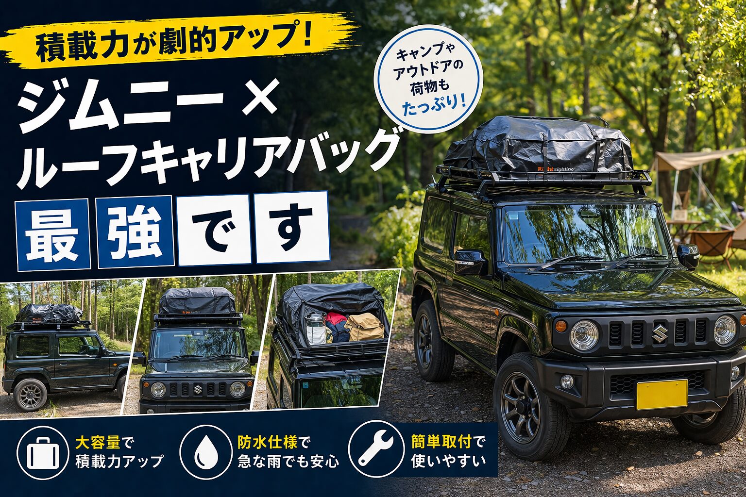ジムニーの積載力が大幅アップ!キャンプなどの荷物を乗せるならルーフキャリアバッグがおすすめ!